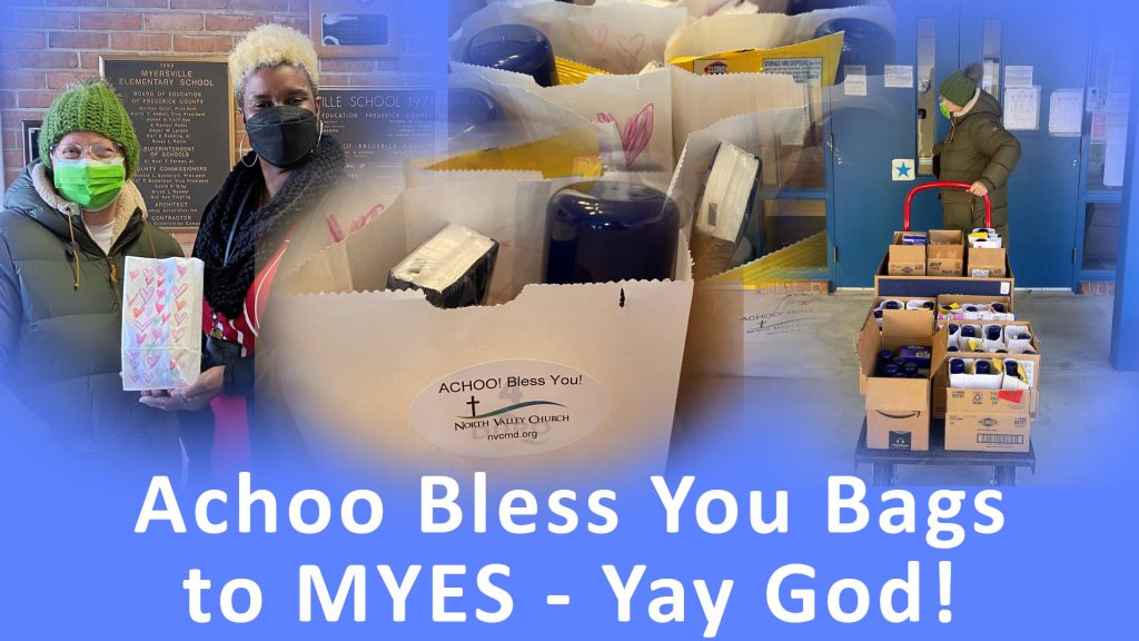 NVC has done local missions including Myersville Elementary School (MYES). We support and encourage the staff through back-to-school and teacher appreciation luncheons. During the winter months, we also have provided Achoo Bless You bags for the teachers. Each bag contains common needs in kid’s classrooms like hand sanitizer, disinfecting wipes, and tissues.